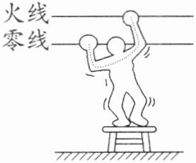 2. 如图所示,人站在干燥的木凳上,左手接触零线,右手接触火线,则( )