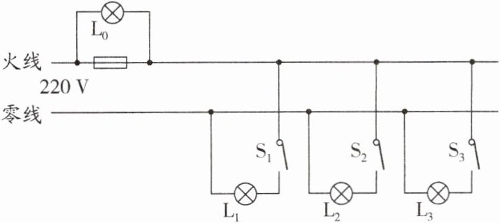 10. 如图是一条刚装好的家庭电路,在未装保险丝之前,先把灯泡 L₀ 接在装保险盒的两个接线柱上,当只闭合$ S_1 $时,L₀ 正常发光;当只闭合$ S_2 $时,L₀ 和$ L_2 $发光都偏暗;当只闭合$ S_3 $时,L₀ 不发光。则下列判断正确的是(四只灯泡的额定电压均为 220 V)( )