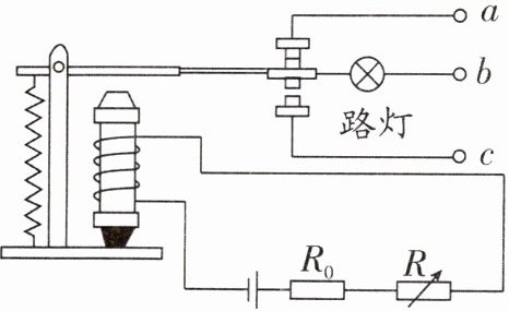 7. 如图所示,$R_{0}$是一个光敏电阻,光敏电阻的阻值随光照强度的增加而减小,R 是电阻箱(已调至合适阻值),它们和继电器组成自动控制电路来控制路灯,白天路灯熄灭,夜晚路灯亮起。下列说法正确的是 ( )