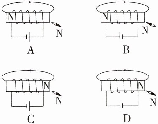 4. 如图所示,通电螺线管 N 极、磁感线方向、小磁针 N 极和电源正负极标注正确的是 ( )