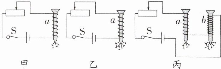 13. 在“探究影响电磁铁磁性强弱的因素”的实验中,电源电压恒定,大、小铁钉各自完全相同,进行如图所示的甲、乙、丙三次实验。甲图中大铁钉的 N 极是______(填“钉尖”或“钉帽”)。通过观察甲、乙两次实验现象,得出的结论是______;通过观察丙图实验现象得出的结论是______。将甲图中的小铁钉换成小钢钉进行实验,断开开关后,发现的有趣的实验现象是______。