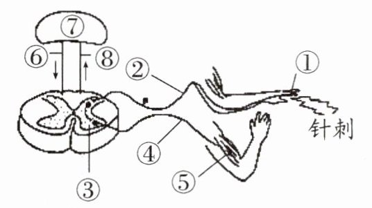 (2) 如果受伤者被刺后迅速缩手,此反射类型属于____。完成此反射的结构称为____。请用数字和箭头写出此过程的神经冲动传导路线:____。