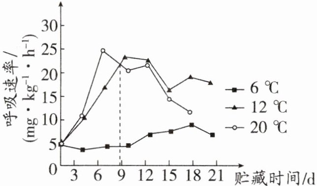 5. 果实在采收后放置一段时间会出现呼吸高峰,这是果实成熟的标志。如图为不同温度条件下果实的呼吸速率与贮藏时间的关系,下列叙述正确的是 ( )