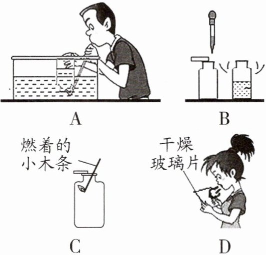 12. 某同学为了比较人体吸入的空气和呼出的气体中氧气、二氧化碳和水蒸气的含量的多少,设计了如下的实验方案,其主要操作步骤如图所示,请根据图示回答问题。