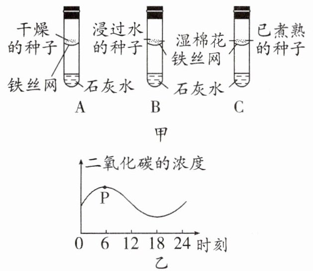 (2) 研究人员在晴天环境下,对栽有绿色植物的密闭玻璃温室进行 24 小时二氧化碳含量的测定,绘制的曲线如图乙所示。据图分析,植物的光合作用开始于____(填“P 点前”“P 点”或“P 点后”)。