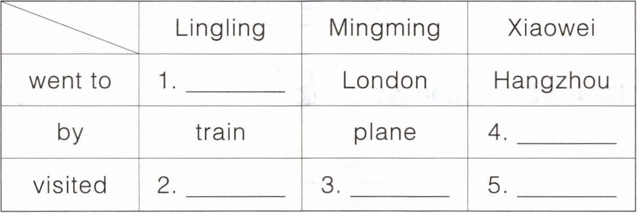 Lingling went to Beijing. She went there by train. She visited the Great Wall. Mingming went to London. He went there by plane. He visited Big Ben. Xiaowei went to Hangzhou. She went there by bus. She visited the West Lake.