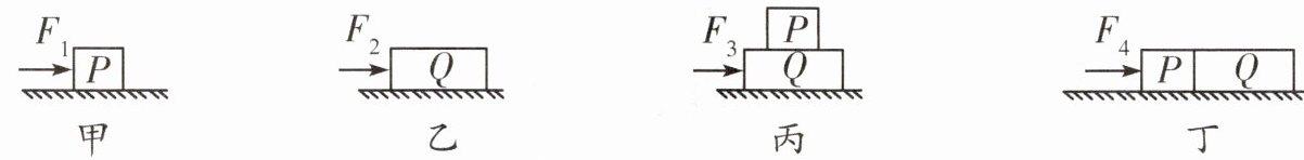 2. 如图所示,在同一水平面上,有表面粗糙程度相同、质量不同($m_{P}<m_{Q}$)的两个木块,按照甲、乙、丙、丁四种方式放置,分别在水平力$F_{1}$、$F_{2}$、$F_{3}和F_{4}$的作用下做匀速直线运动,则下列关系式正确的是 ()