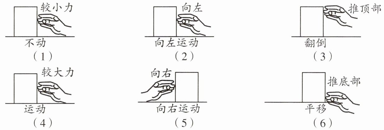 小明和同学们利用实验室的长方体木块做了“探究影响力的作用效果的因素”的实验,如图所示,由(1)(4)说明____影响力的作用效果;(2)(5)说明____影响力的作用效果;(3)(6)说明____影响力的作用效果.本实验运用的物理研究方法是____.