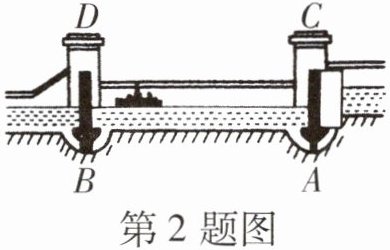 2. 如图所示,轮船由下游经过船闸驶往上游。船进入闸室后,先关闭阀门B和闸门D,再打开阀门____,当闸室中水位与上游水位____时,打开闸门C,船驶向上游。