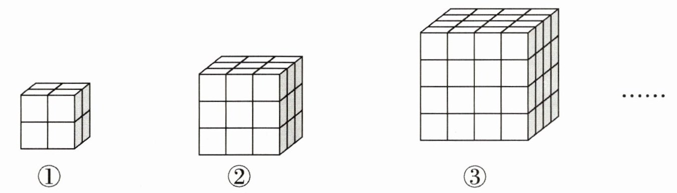 上颜色。①、②、③中,三面、两面、一面涂色以及没有涂色的小正方体各有多少个?按这样的规律拼下去,第④、⑤个正方体的结果会是怎样的呢? (究成下表, 看看每类小正方体在什么位置。 )