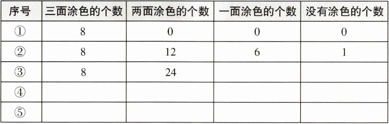|序号|三面涂色的个数|两面涂色的个数|一面涂色的个数|没有涂色的个数|