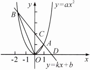 10. 如图,一次函数$y= kx+b的图象与二次函数y= ax^{2}图象交于点A(1,m)和B(-2,4)$,与$y轴交于点C$,与$x轴交于点D$。