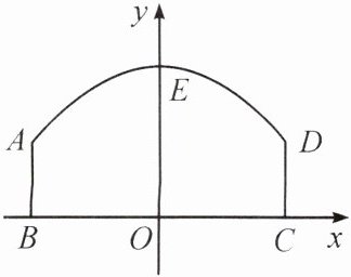2.如图,一隧道的横截面是由一段抛物线及矩形的三边围成的,隧道宽$BC= 10m$,矩形部分的高$AB= 3m$,抛物线的最高点E离地面的距离$OE= 6m$。以直线BC为x轴,直线OE为y轴建立平面直角坐标系如下:
