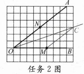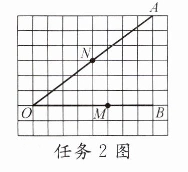 任务2:已知∠AOB在网格中的位置如图,O在格点上,且OM= ON,请用没有刻度的直尺作出∠AOB的角平分线.