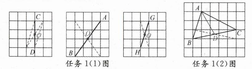 任务1:(1)在边长为1的小正方形组成的网格中,对于任意一条连接格点的线段,请用没有刻度的直尺找出它的中点O.