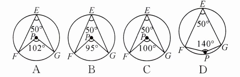 .(3)【已知圆周角,判断圆心】如图,点E,F,G在圆上,∠FEG= 50°,则点P是圆心的是 (