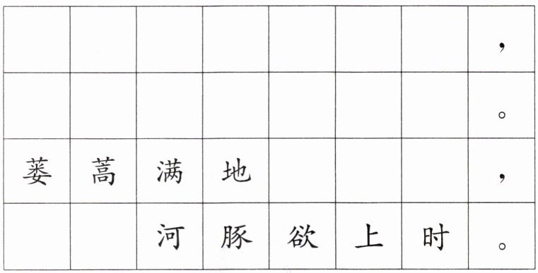 【解析】:1. 本题考查对古诗《惠崇春江晚景》的背诵与默写。根据已给出的部分诗句“萎蒿满地芦芽短,正是河豚欲上时”,结合古诗原文,前两句应为“竹外桃花三两枝,春江水暖鸭先知”。注意“枝”“暖”“鸭”等字的正确书写。
