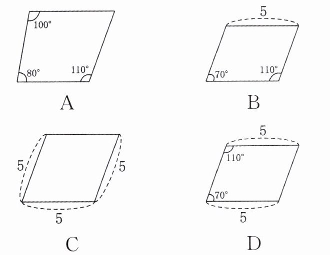 4.(河北中考)依据所标数据,下列一定为平行四边形的是( )
