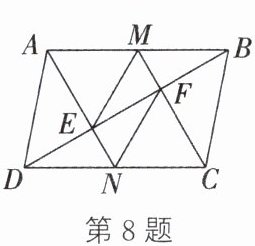 8. 如图,在$□ ABCD$中,$\angle ABD = 30^{\circ}$,$AB = 4$,$AE\perp BD于点E$,$CF\perp BD于点F$,且$E$,$F恰好是BD$的三等分点,延长$AE$,$CF分别交CD$,$AB于点N$,$M$,连接$EM$,$FN$.若$M$,$N分别是AB$,$CD$的中点,则四边形$MENF$的面积是( )