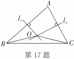 17. ★如图,在$\triangle ABC$中,$AB$,$AC的垂直平分线l_{1}$,$l_{2}相交于点O$. 若$\angle BAC = 76^{\circ}$,则$\angle OBC$的度数为______.