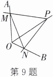 9. ★如图,$P为定角\angle AOB$的平分线上的一个定点,且$\angle MPN与\angle AOB$互补. 若$\angle MPN在绕点P$旋转的过程中,其两边分别与$OA$,$OB相交于M$,$N$两点,连接$MN$,有下列结论:①$PM = PN$恒成立;②$OM + ON$的值不变;③四边形$PMON$的面积不变;④$MN$的长不变. 其中,正确的个数为( )