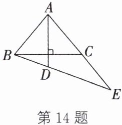 14. 如图,在等腰三角形$ABC$中,$AB = AC$,$\angle BAC = 80^{\circ}$,$AD \perp BC$,$AD = AB$,连接$BD$并延长,交$AC的延长线于点E$,则$\angle E$的度数是______.
