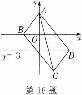 16. 如图,$□ ABCD$ 的顶点 $A$ 的坐标为 $(0, 4)$,顶点 $B$,$D$ 分别在 $x$ 轴和直线 $y = -3$ 上,则对角线 $AC$ 长的最小值为______.