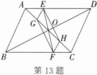 13. 如图,$□ ABCD的对角线AC$,$BD交于点O$,$EF过点O交AD于点E$,交$BC于点F$,$G是OA$的中点,$H是OC$的中点,连接$EG$,$GF$,$FH$,$EH$。求证:四边形$EGFH$是平行四边形。