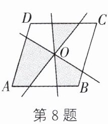 8. 如图,四边形ABCD是菱形,O是两条对角线的交点,过点O的三条直线将菱形分成涂色部分和空白部分. 如果菱形的两条对角线的长分别为6和8,那么涂色部分的面积为______.