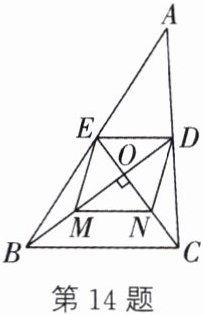 14. 如图,在△ABC中,D,E分别是边AC,AB的中点,BD⊥CE于点O,M,N分别是OB,OC的中点. 若OB= 8,OC= 6,则四边形DEMN的周长是 ( )