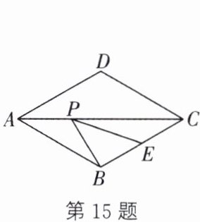 15. 如图,菱形ABCD的边长为2,∠DAB= 60°,E为BC的中点,在对角线AC上存在一点P,使△PBE的周长最小,则△PBE周长的最小值是______.