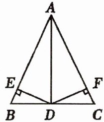 ∴ $ BD = CD $,在 $ Rt△BDE $ 和 $ Rt△CDF $ 中 $ \begin{cases} BD = CD \\ BE = CF \end{cases} $,
