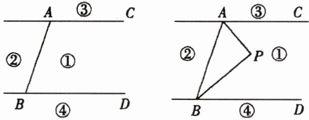 14. 如下图,直线$AC// BD$,连接AB,直线AC,BD及线段AB把平面分成①,②,③,④四个部分,规定:线上各点不属于任何部分.当动点P落在某个部位时,连接PA,PB构成$∠PAC,∠APB,∠PBD$三个角.(提示:有公共端点的两条重合的射线所组成的角是$0^{\circ }$角)当动点P落在第①部分时,试说明:$∠APB= ∠PAC+∠PBD$.