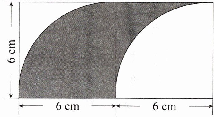 【解析】:观察图形可知,涂色部分由左侧的四分之一圆和右侧的不规则图形组成。左侧四分之一圆的半径为6cm,其面积为$\frac{1}{4}×π×6² = 9π$cm²。右侧图形可通过平移转化,将右侧涂色部分填补到左侧空白区域,发现整个涂色部分组合后正好是一个边长为6cm的正方形。正方形面积 = 边长×边长,即$6×6 = 36$cm²。