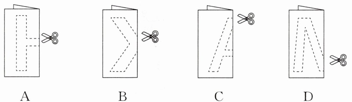选项C:将长方形纸对折后,按照图示剪法剪下,展开后会得到一个类似“A”但顶部有缺口的形状,不符合题意。