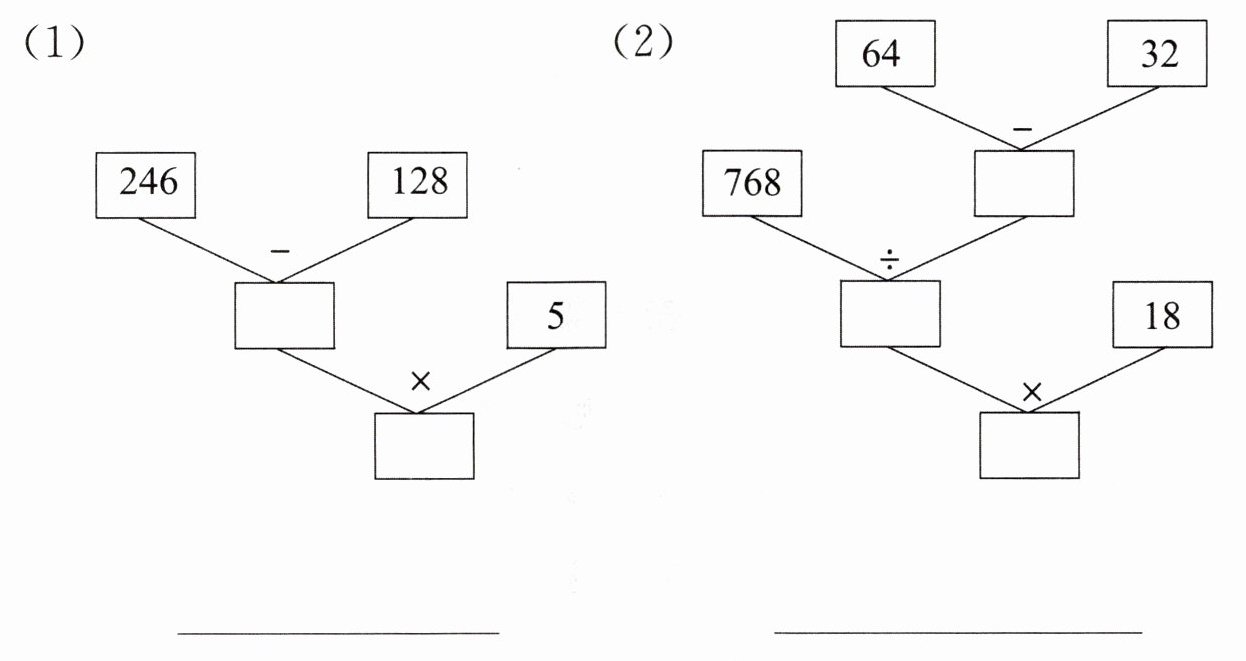 二、按照顺序计算,并把得数填在下面的$□$里,然后列出综合算式。