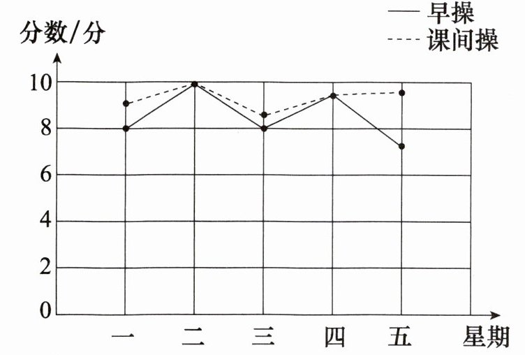 (2)分别计算早操和课间操的平均得分来比较。早操得分:星期一8分,星期二10分,星期三8分,星期四9分,星期五7分,总和为8+10+8+9+7=42分,平均分为42÷5=8.4分。课间操得分:星期一9分,星期二10分,星期三8.5分,星期四9.5分,星期五9.5分,总和约为9+10+8.5+9.5+9.5=46.5分,平均分为46.5÷5=9.3分。因为9.3>8.4,所以课间操做得好。