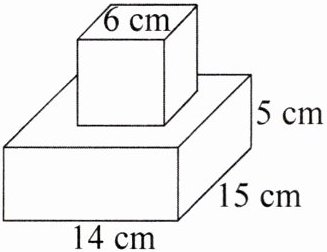 【解析】:该几何体由一个长方体和一个正方体组成,体积为两者体积之和。长方体的长、宽、高分别为14cm、15cm、5cm,根据长方体体积公式$V = 长×宽×高$,其体积为$14×15×5$。正方体的棱长为6cm,根据正方体体积公式$V = 棱长×棱长×棱长$,其体积为$6×6×6$。将两者体积相加可得总体积。