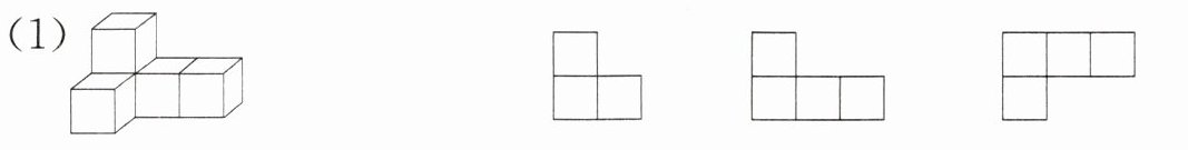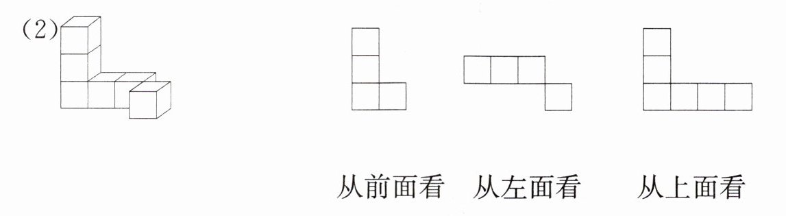 (2)对于第二个立体图形,从前面看,能看到三层,第一层有3个小正方形,第二层左边有1个小正方形,第三层左边有1个小正方形,对应第三个图形;从左面看,能看到三层,每层左边各有1个小正方形,对应第一个图形;从上面看,能看到两行,前面一行有3个小正方形,后面一行右边有1个小正方形,对应第二个图形。