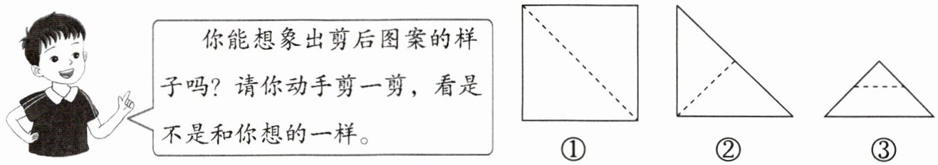 把一张正方形纸(如图①)沿虚线对折一次得到图②,再沿虚线对折一次得到图③,然后用剪刀沿图③中的虚线(虚线与底边平行)剪去一个角。展开后的图形是
