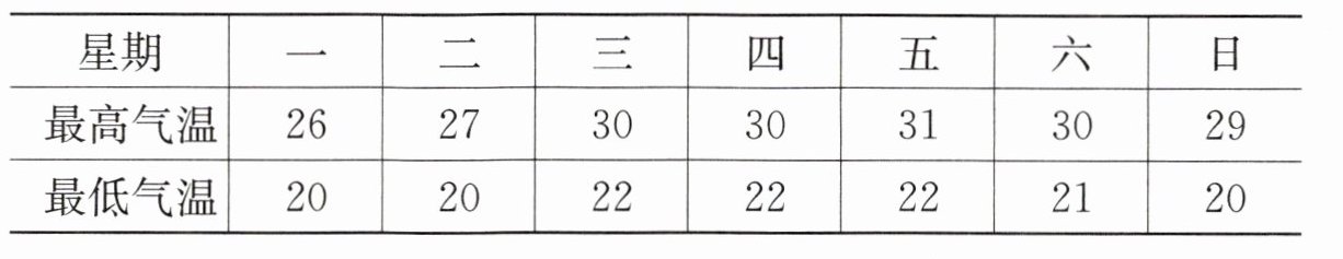 最高气温:星期一$(一,26)$、星期二$(二,27)$、星期三$(三,30)$、星期四$(四,30)$、星期五$(五,31)$、星期六$(六,30)$、星期日$(日,29)$。