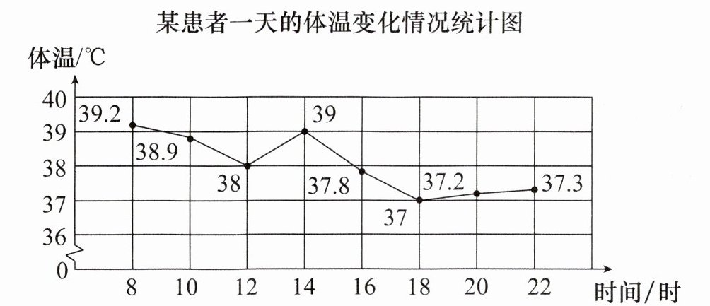 (2) 横轴上相邻两个时间点分别为8时、10时、12时等,10-8=2(小时),12-10=2(小时),以此类推,可得出护士每隔2小时为患者量一次体温。