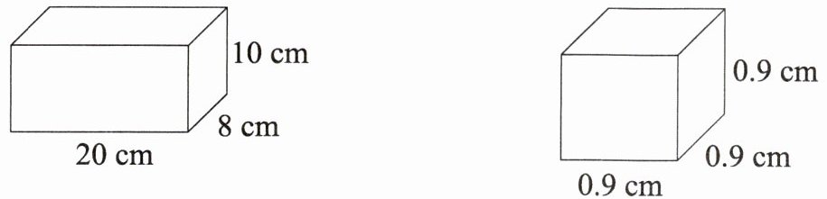 右图为正方体,棱长0.9cm。正方体表面积公式为$S = 6a²$,体积公式为$V = a³$。代入数据可得表面积:$6×0.9²=6×0.81 = 4.86$($cm²$);体积:$0.9³ = 0.729$($cm³$)。