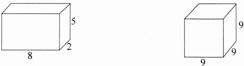 【解析】:左图为长方体,长8厘米、宽2厘米、高5厘米,根据长方体表面积公式$S=(ab + ah + bh)×2$,可得表面积为$(8×2 + 8×5 + 2×5)×2=(16 + 40 + 10)×2=66×2=132$平方厘米;右图为正方体,棱长9厘米,根据正方体表面积公式$S=6a²$,可得表面积为$6×9²=6×81=486$平方厘米。