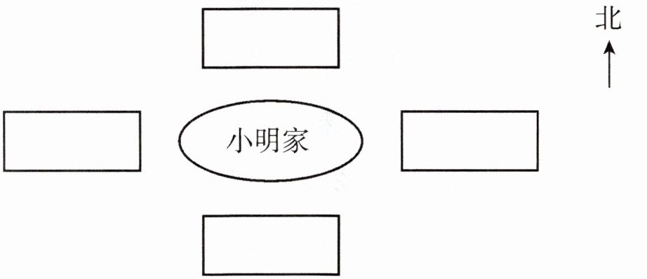 小明家的北面是一个大型超市,南面是一家医院,西面是一家银行,东面是一所学校,请你在下图中适当的位置填出这些地方的名称。