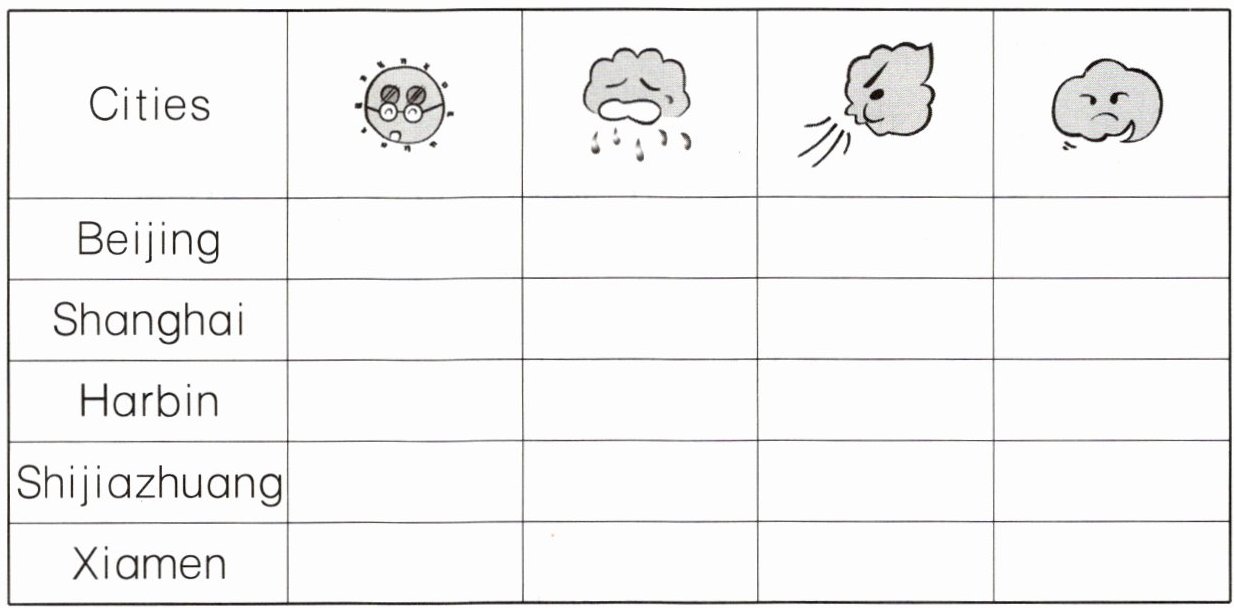 Ⅳ. 听一听今天晚上下列城市的天气预报,并记录下来。
