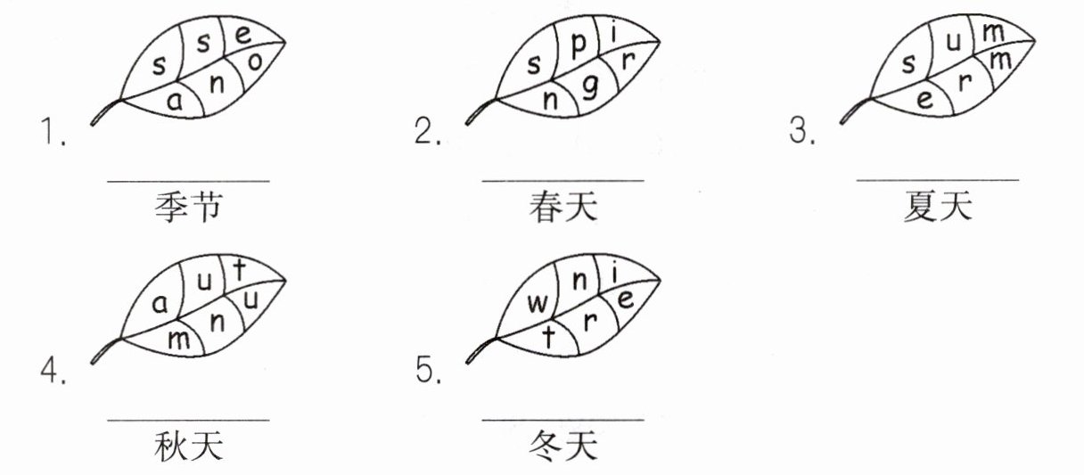 1. “季节”对应的英语单词是“season”,由所给字母“s”“e”“a”“s”“o”“n”可组成。