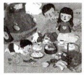 5. 第八空根据图片中妈妈在做饭的场景,可知是“cooking”(cook的现在分词形式),表示“正在做饭”。