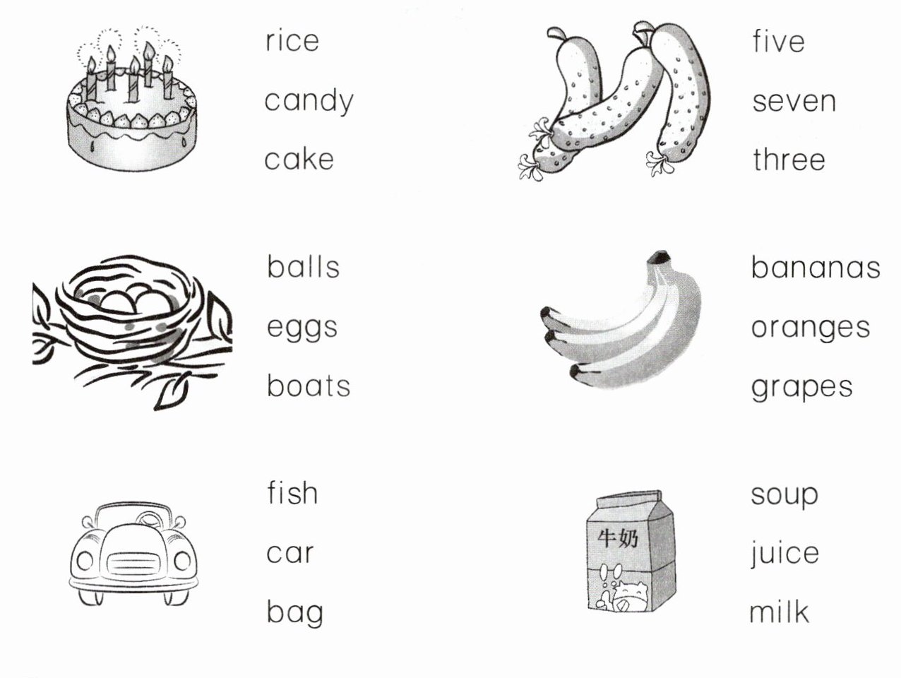 1. 第一幅图是蛋糕,对应的单词是“cake”。