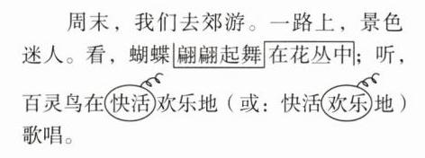 周末,我们去郊游。一路上,景色迷人。看,蝴蝶翩翩起舞在花丛中;听,百灵鸟在快活欢乐地歌唱。